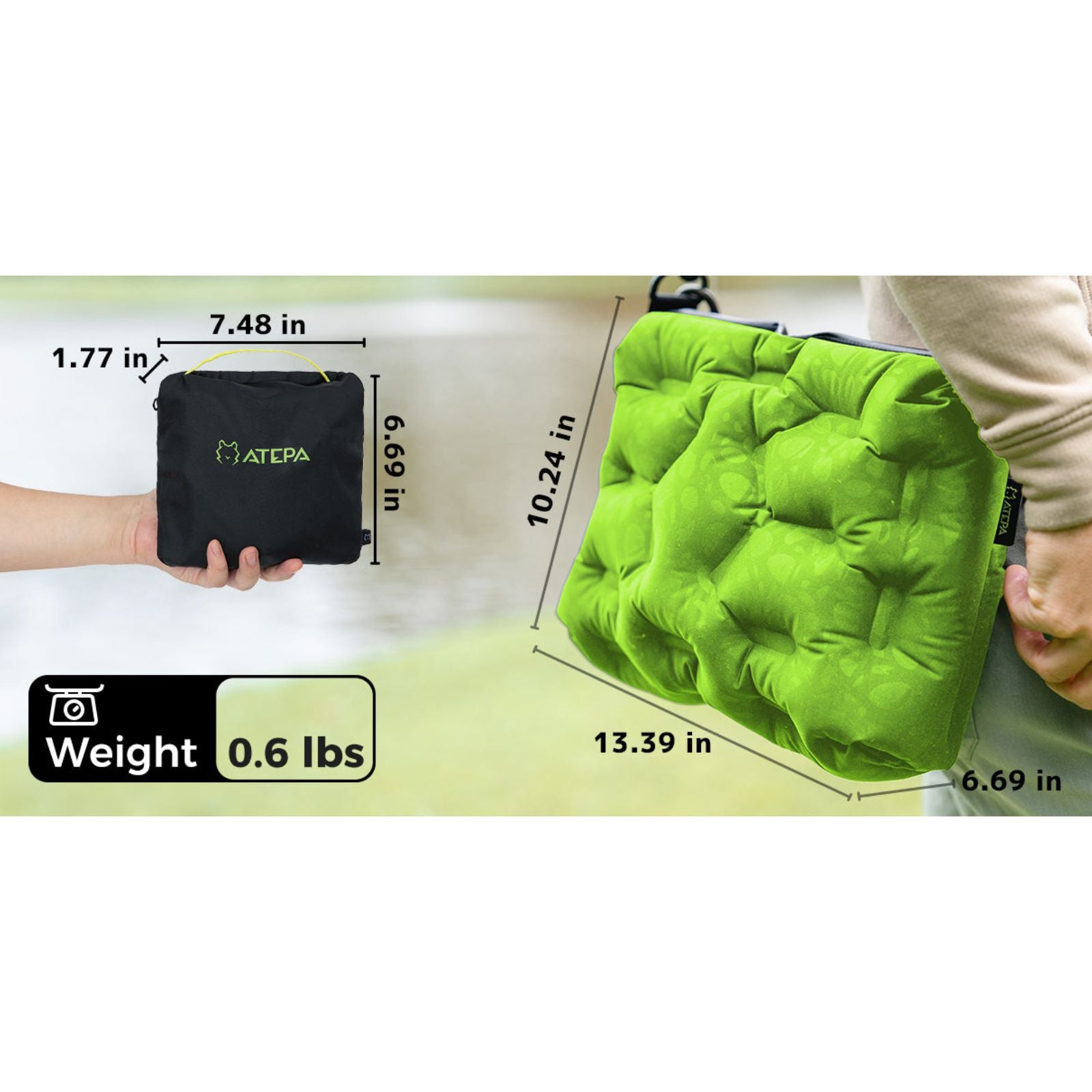 Der ATEPA Cloud Air Bag lässt sich auf Handflächengröße zusammenpacken und passt so problemlos in jede Tasche. Er ist leicht und tragbar und ist so konzipiert, dass er immer zur Stelle ist, wenn Sie ihn brauchen, und keinen Platz wegnimmt, wenn Sie ihn nicht brauchen.