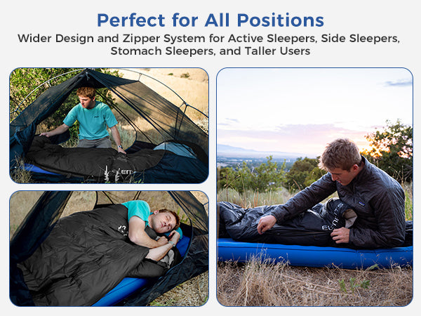 The Wider Design and Zipper System make the sleeping bag perfect for for Active Sleepers, Side Sleepers, Stomach Sleepers, and Taller Users.