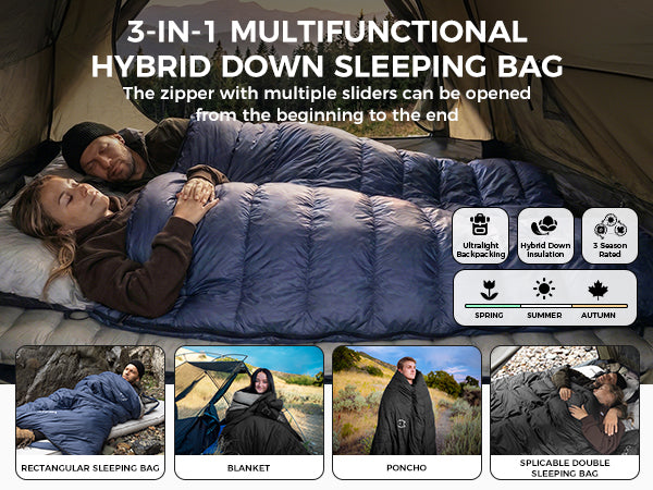 The zipper with multiple sliders can be opened from the beginning to the end - making it flexible to be used as a double sleeping bag. You own more than 1 sleeping bag with it.
