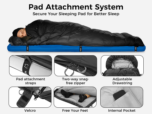 Designed with dual 2-way zippers and pad attachment straps, the sleeping bag offers a better sleep at night
