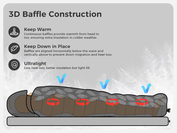This sleeping bag adopts3D baffle technology, consisting of independent insulation lofts. Each loft's down is stable and evenly distributed, effectively preventing down from running and firmly lock in heat