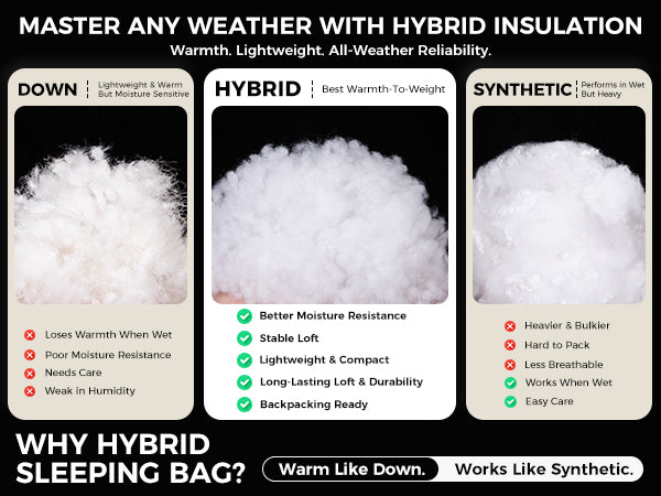 Great question! While 100% down is lightweight, it loses warmth when wet. This hybrid fill (down + synthetic) keeps loft even in humid conditions. It’s more reliable for backpacking in damp environments where pure down may fail.