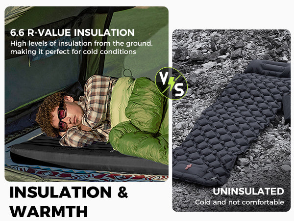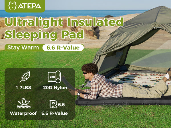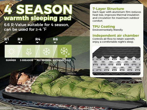 This insulated sleeping pad features certified R-Value of 6.6 and a 7-layer thermal structure, blocking ground cold down to -20°C (-4°F). Perfect as an all season sleeping pad. No more shivering nights outdoors - just warm, restful sleep.
