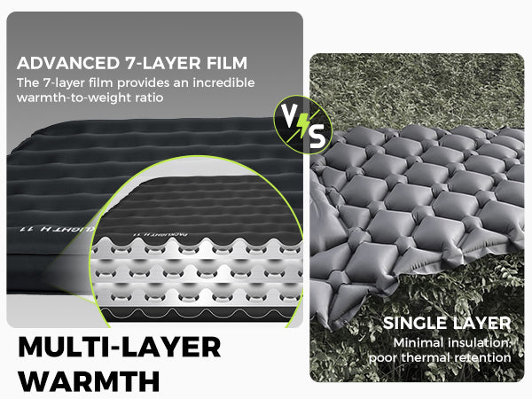 The 7-layer film provides an incredible warmth-to-weight ratio compared to any other sleeping pads