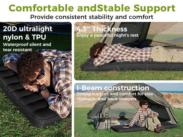 Featuring I-Beam construction and 6 layers of aluminum insulation, this pad offers exceptional elasticity and support. Its 10cm (3.94”) thickness shields you from rocky terrain, delivering a plush, stable sleeping surface that adapts to your body for superior comfort whether your're side, stomach or back sleepers.