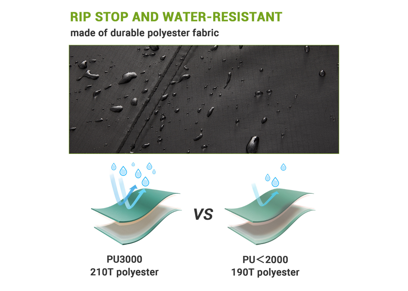- Outer Fabric: 100% Polyester 210T Ripstop PU Coated, Waterproof 3000mm