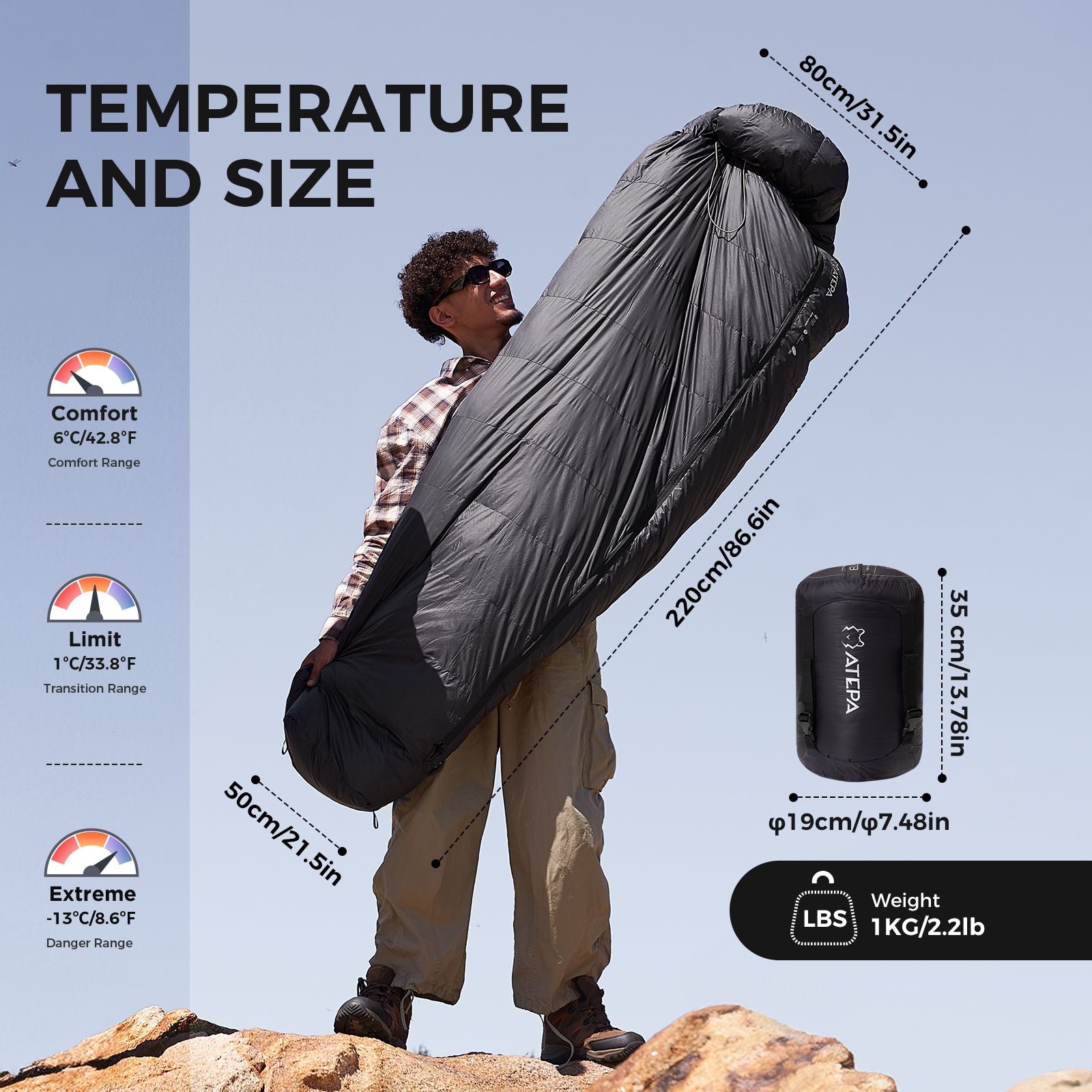 From a cozy 6°C (42.8°F) to a rugged -13°C (8.6°F), the ATEPA Coldmaster is built to handle a variety of outdoor conditions. Lightweight and versatile, it’s ideal for solo explorers seeking warmth and comfort. A true ultralight sleeping bag designed for all seasons, it’s the perfect companion for your adventures.